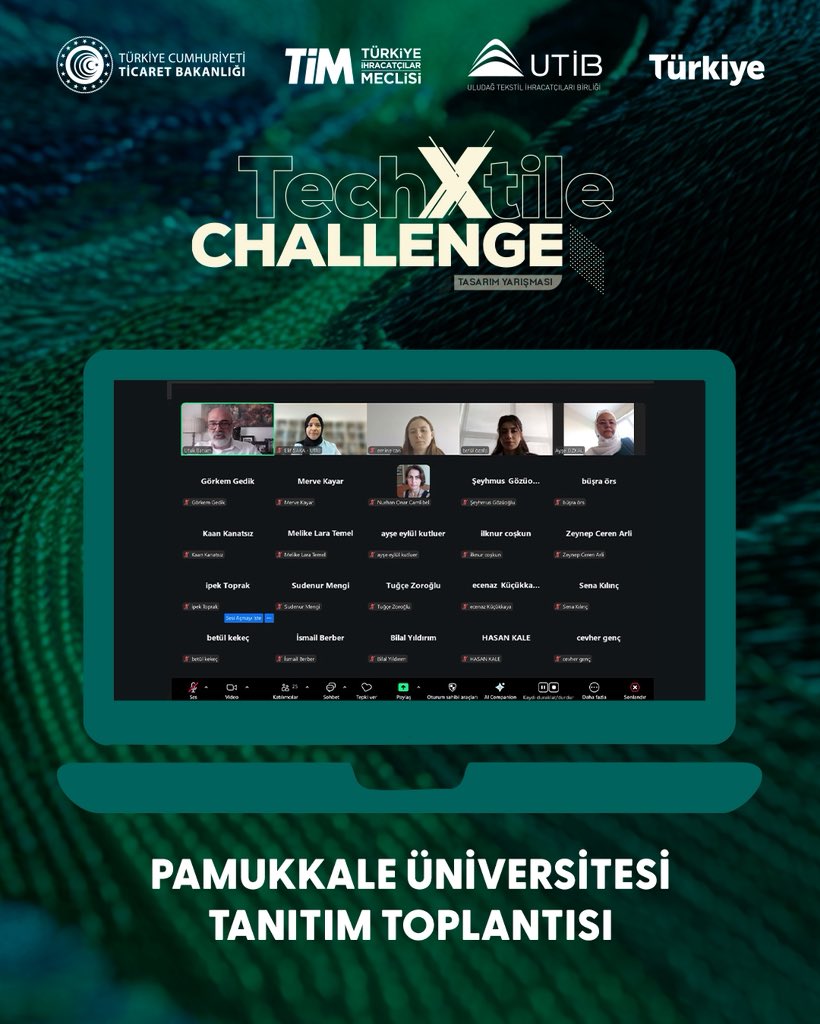 TechXtile Challenge Tasarım Yarışması kapsamında farklı üniversitelerde çevrimiçi olarak düzenlenen bilgilendirme toplantılarında Program Koordinatörü Ufuk Batum, katılımcılara TechXtile’ın yenilikçi vizyonunu, sürdürülebilir tekstil hedeflerini ve yarışmanın sunduğu fırsatları anlattı. Yoğun ilgiyle gerçekleşen toplantılarda, yarışma süreci, başvuru koşulları ve değerlendirme kriterleri hakkında kapsamlı bilgiler paylaşıldı.