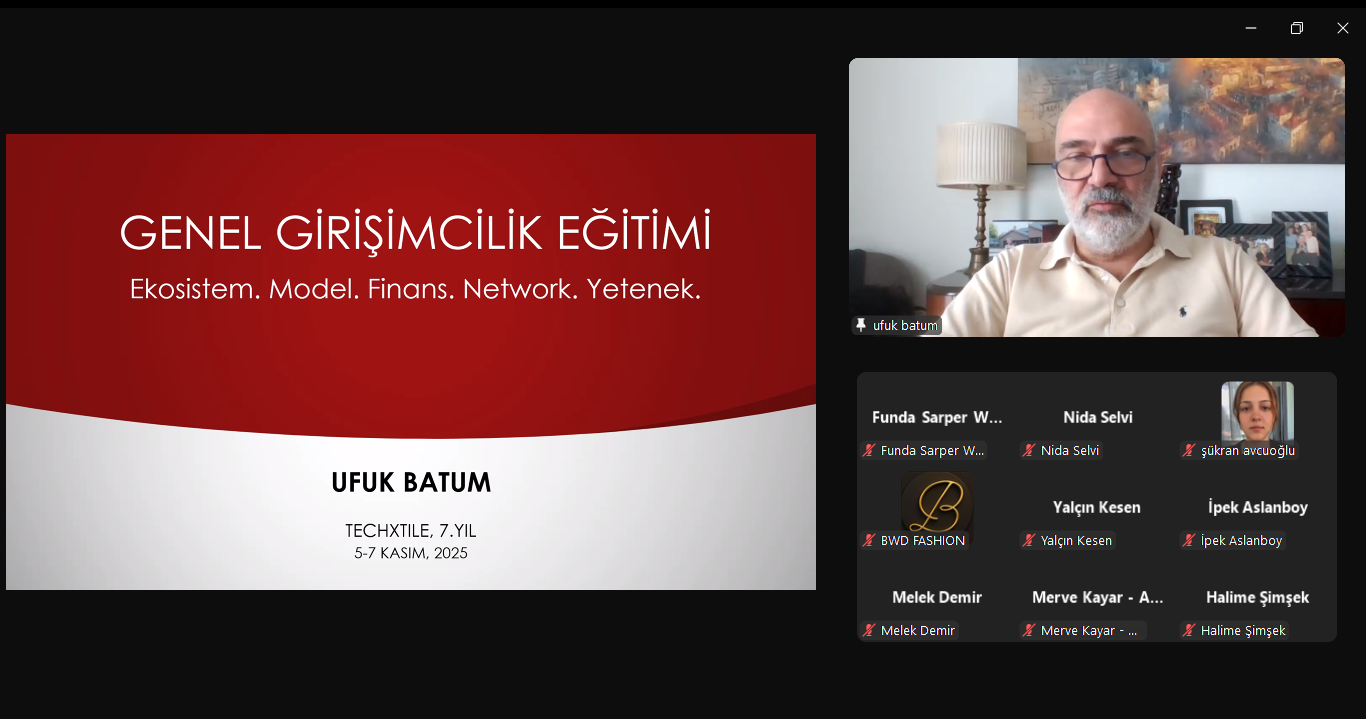 Bu yıl “Verimlilik” temasıyla yedincisi düzenlenen TechXtile Challenge, tekstil, teknik tekstil vb. alanlarda yenilikçi fikirlerin geliştirilmesini teşvik eden, girişimcileri sanayi, akademi ve yatırım ekosistemiyle buluşturan kapsamlı bir inovasyon platformu niteliği taşımaya devam ediyor. Program kapsamında, ön eleme değerlendirmelerine geçilmeden önce tüm başvuru sahiplerine yönelik 'Genel Girişimcilik Semineri' başlıklı seminerler düzenlendi. Program koordinatörü Ufuk Batum tarafından çevrimiçi olarak gerçekleştirilen seminerlerde katılımcılar; girişimcilik ekosisteminin yapısı, iş modeli geliştirme yöntemleri, ticarileşme stratejileri ve iş birliği ağlarının oluşturulmasına yönelik temel bilgiler edindi.